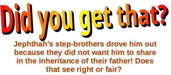 And Jephthah said to them, "My people and I were in a great struggle with the people of Ammon; and when I called you, you did not deliver me out of their hands. So when I saw that you would not deliver me, I took my life in my hands and crossed over against the people of Ammon; and YAHWEH delivered them into my hand. Why then have you come up to me this day to fight against me?"