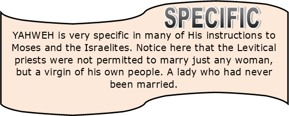 'And he shall take a wife in her virginity. A widow or a divorced woman or a defiled woman or a harlot—these he shall not marry; but he shall take a virgin of his own people as wife. Nor shall he profane his posterity among his people, for I YAHWEH sanctify him.'"