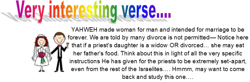 'They shall not take a wife who is a harlot or a defiled woman, nor shall they take a woman divorced from her husband; for the priest is holy to his Elohim. Therefore you shall consecrate him, for he offers the bread of your Elohim. He shall be holy to you, for I YAHWEH, who sanctify you, am holy. The daughter of any priest, if she profanes herself by playing the harlot, she profanes her father. She shall be burned with fire.